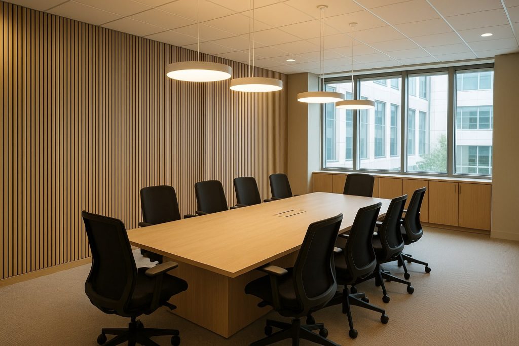 A timber slat feature wall can define a living room, home office, or dining area. Beyond just looking good, these acoustic timber slats help control sound — reducing reverberation and making conversations or media experiences more enjoyable.