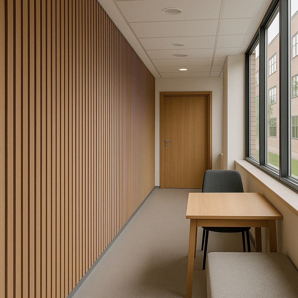 One of the key advantages of Stilj™ acoustic wood paneling is its ability to improve sound performance in even the most design-led spaces. The timber slats interrupt and diffuse noise, while the felt backing absorbs and dampens it — helping reduce sharp echoes and background hum.